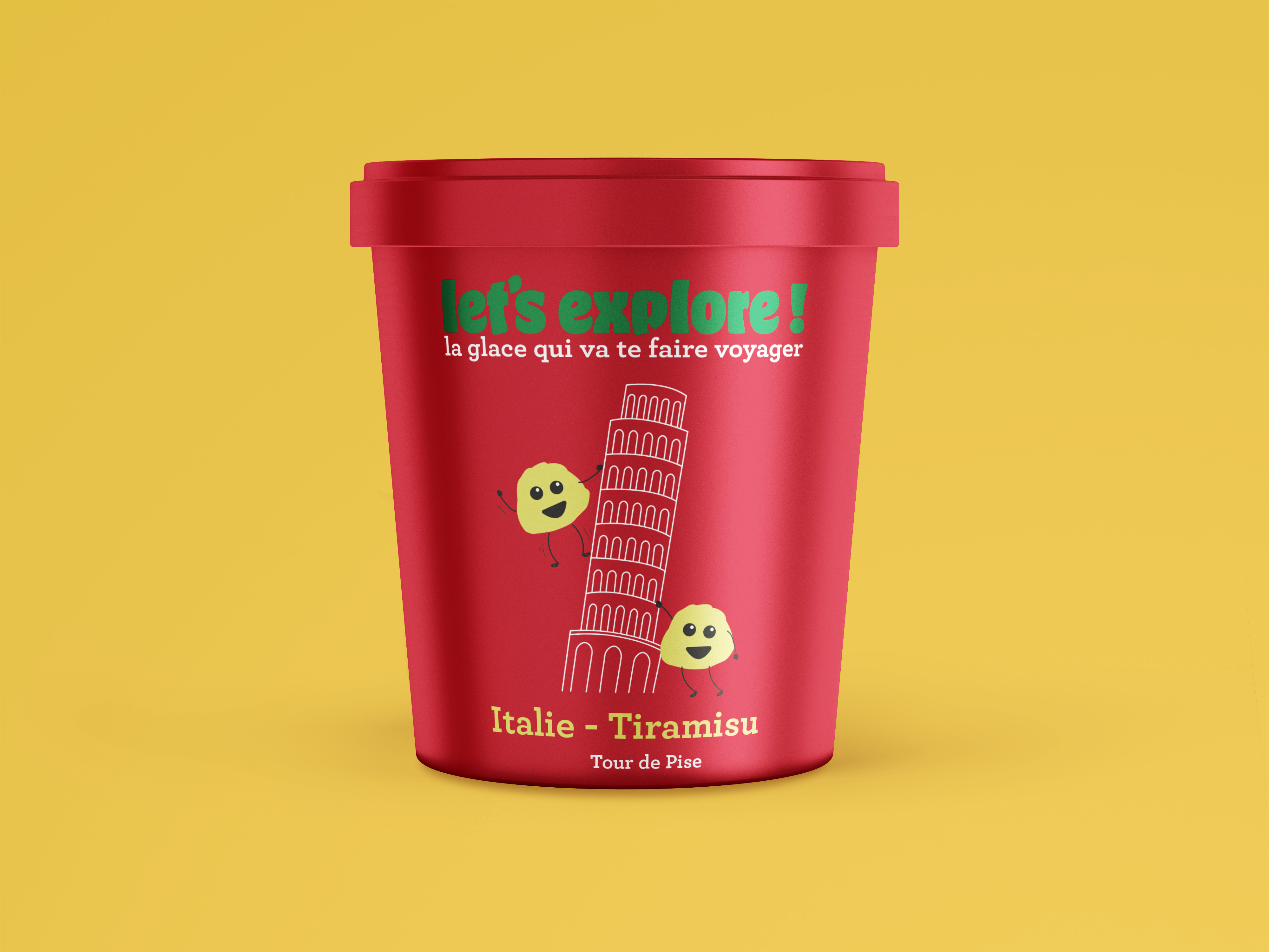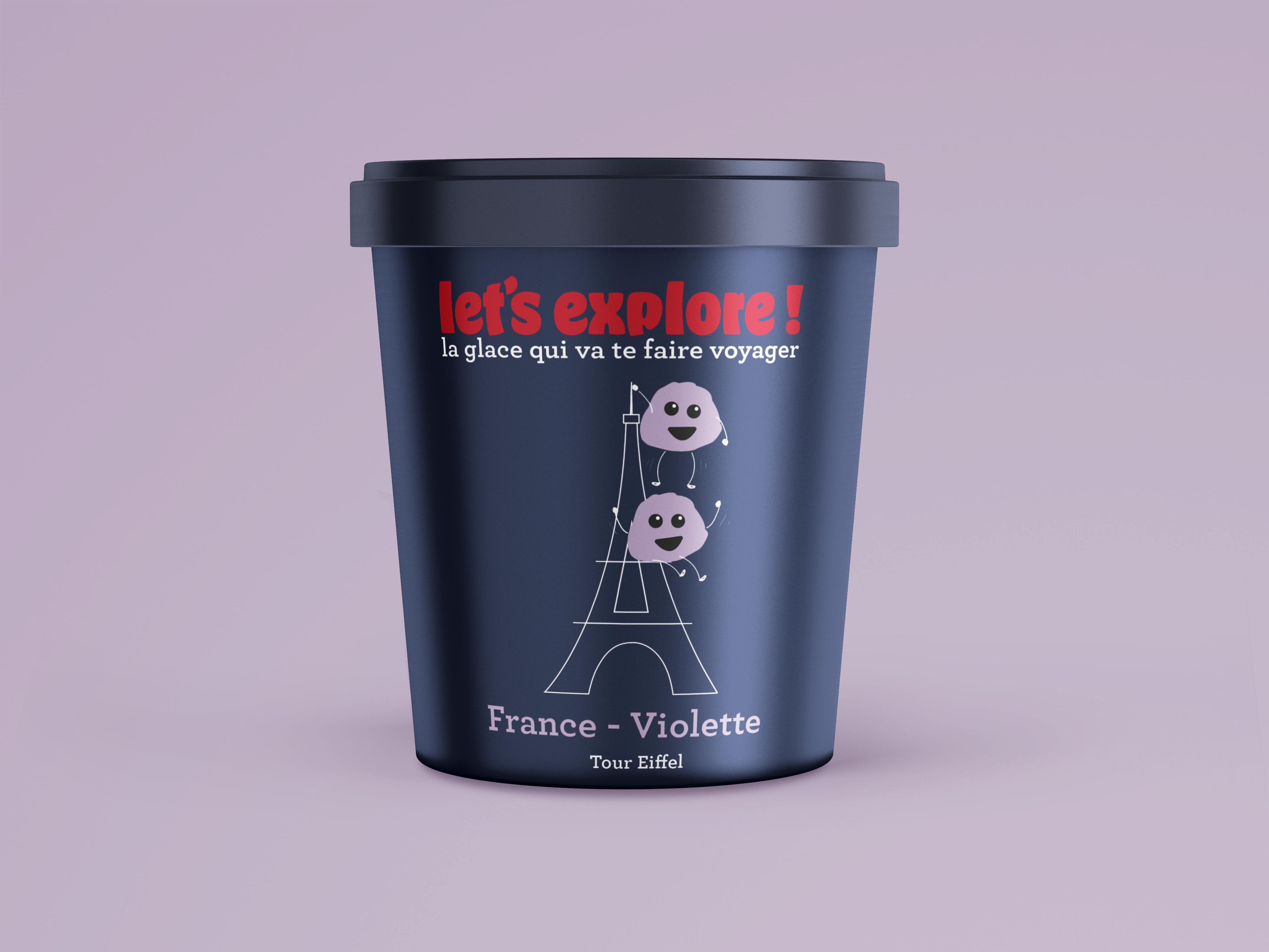 J'ai choisi d'appeler la marque d'Adrian "Let's explore" avec pour slogan "la glace qui va te faire voyager" en référence à l'aventure et aux voyages qu'il a pu faire ces dernières années. J'ai décidé de créer un lien de proximité avec le consommateur en inventant des petites boules de glace personnifiées. Sur le packaging des glaces, nous pouvons voir un monument emblématique qui représente le pays et les petits personnages qui s'amusent avec le monument et avec le consommateur. Le choix de la gamme chromatique, a été déterminé par les drapeaux de chaque pays.